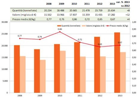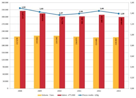 Trend dei consumi di melone dal 2008 al 2013. In giallo il volume (ton), in rosso il valore (.000 euro) mentre la riga blu indica l'andamento del prezzo medio (euro/kg). (Per ingrandire il grafico clicca qui).