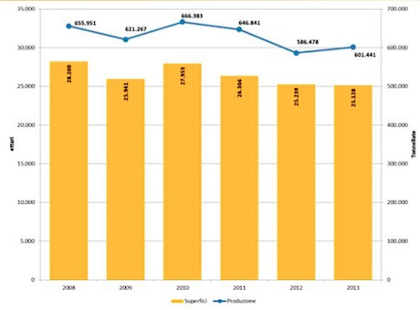 Trend di superfici (istogramma giallo) e produzioni (Linea blu). (Per ingrandire il grafico clicca qui).