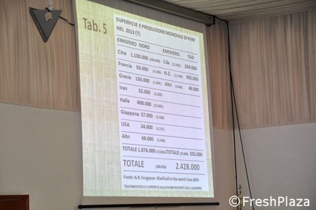 "La coltivazione del kiwi nel mondo – ha spiegato Elisa Macchi – ha vissuto una fase di espansione importantissima, con un tasso medio di crescita degli impianti di circa il 5% particolarmente evidente fino al 2009. Negli anni successivi, la crescita è stata meno evidente registrando un incremento di circa l'1%. Dal 2000 al 2013 la superficie destinata al kiwi è cresciuta di oltre il 60% e un forte impulso è arrivato proprio dalla Cina. Fino al 2011, l'espansione ha raggiunto quote importanti (fino al 64%) per poi cominciare a registrare una drastica diminuzione imputabile alla diffusione della batteriosi".