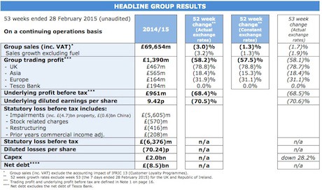 Quasi 6,4 miliardi di sterline (9 miliardi di euro) di perdita di fatturato rispetto al febbraio 2014. Un "buco" causato dalla svalutazione del suo patrimonio immobiliare (-4,7 miliardi di sterline), in particolare i supermercati inglesi, e dalle difficoltà sul mercato nazionale: le vendite sono in calo, oltre il 3% in dodici mesi. Dati al ribasso anche all'estero, in particolare in Corea del Sud, e deludenti le prestazioni in Europa.