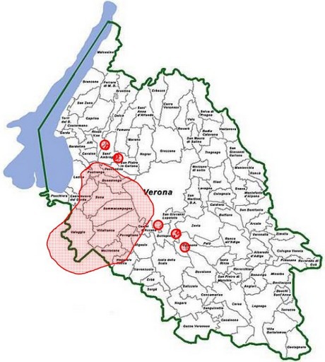 La provincia di Verona. L'area rossa grande rappresenta l'area storica colpita dalla moria del kiwi. I cerchi rossi più piccoli sono nuovi focolai registrati (Fonte Lorenzo Tosi - Agrea)