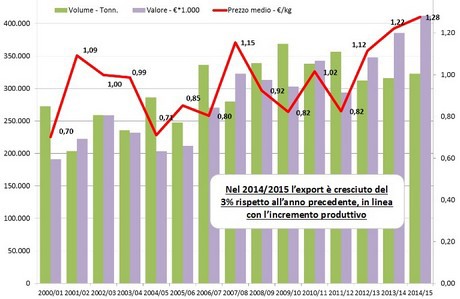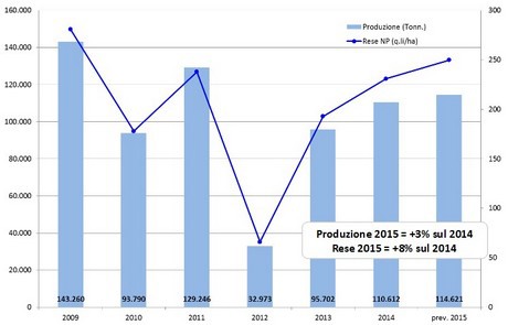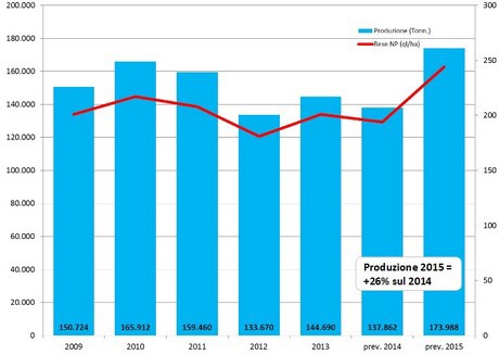 In Piemonte l'aumento dei volumi prodotti sarà più contenuto (+3%); una crescita spinta soprattutto da un aumento delle rese dell'8%. Le previsioni per la nuova stagione parlano di una produzione piemontese nell'ordine di circa 114mila tonnellate.