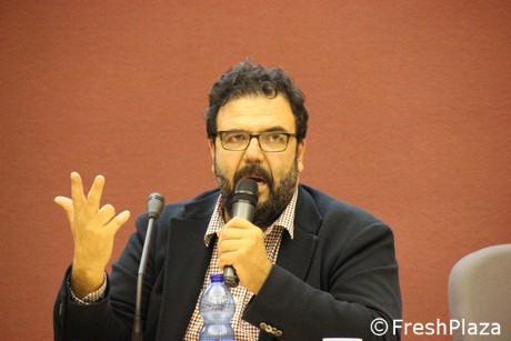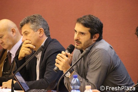 Tomas Bosi, del CSO - Centro Servizi Ortofrutticoli, mentre illustra le stime produttive per la prossima campagna del kiwi.