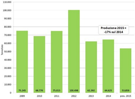 Complice l'asfissia, secondo i dati CSO presentati al convegno veronese da Tomas Bosi, si stima che per questa campagna la produzione veronese segnerà un tonfo del 25% in volume (a fronte di un calo del 5% in termini di superfici), crollando a poco più di 42mila tonnellate prodotte. Considerando anche le altre provincie produttrici, Rovigo (che dopo la grandine del 2013 torna su rese normali) e Treviso (qui le voci sono contrastanti, tra aumento dei volumi e diminuzione) la produzione 2015 del Veneto si assesterà su poco meno di 54mila tonnellate (-17% rispetto al 2014).