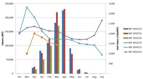 I volumi (in istogramma) e il valore (le linee) delle esportazioni cilene di uva da tavola nelle stagioni 2013/14, 2014/15 e 2015/16. Clicca qui per consultare il grafico a dimensioni maggiori. (Grafico USDA su fonte Servicio Nacional de Aduana e ODEPA)