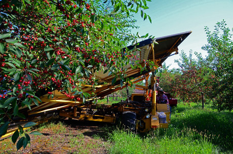 Macchina scavallatrice americana, utilizzata per la raccolta in continuo di piccoli frutti e di amarene in sistemi di coltivazione superintensivi.