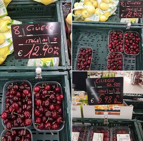 A detta del produttore, su Facebook circolano immagini di prodotto italiano venduto nelle catene della Grande distribuzione nazionale anche a 13-15 euro/kg. "Qui da noi, in generale un prezzo medio al produttore per le ciliegie si aggira su un range di 1,50-2,50 euro/kg".
