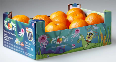 Il packaging per la frutta concepito da Smurfit Kappa Solid Board Packaging crea valore aggiunto per tutta la catena di distribuzione. Qui sotto vediamo la confezione da 2,3 kg di clementine, utilizzata negli Stati Uniti. Le clementine sono popolari tra i bambini per via del loro sapore e della facilità con cui si sbucciano: il packaging colorato con le stampe degli eroi dei cartoni animati completa l'attrattiva.