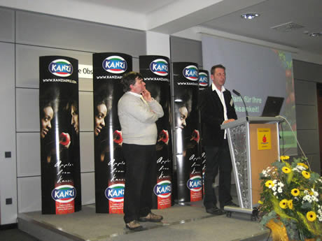 Dopo il discorso di apertura di Dietmar Bahler (Direttore Divisione Frutta, BayWa AG), Urs Luder (CEO Greenstar Kanzi Europe NV) ha ripercorso le tappe del successo di Kanzi® negli ultimi 5 anni e ha tracciato la situazione attuale della mela Kanzi. In seguito Michael Winstel(Consulenza e Product Management, WOG) e Jos Meesters (Direttore Produzione, Veiling Haspengouw) nella loro presentazione hanno evidenziato questioni tecniche relative alla coltivazione e i risultati delle prove di conservazione.