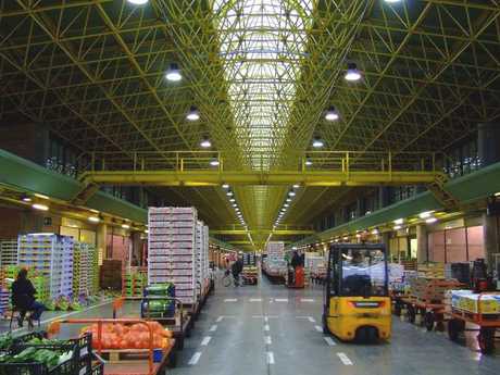 Il Mercato ortofrutticolo coperto si estende per un chilometro, con gli stand degli operatori disposti su entrambi i lati e una vasta corsia centrale per la movimentazione delle merci.