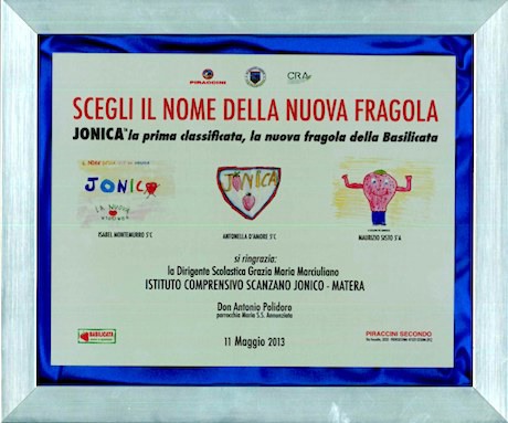 La fantasia dei bambini si è espressa in una serie di nomi e di disegni che ha portato al battesimo di "Jonica", un nome che lega fortemente la varietà al territorio. La Piraccini Secondo ha premiato Isabel Montemurro e Antonella D'Amore per la proposta vincitrice e Maurizio Sisto per il disegno più simpatico (riportato a destra della targa qui sotto ).
