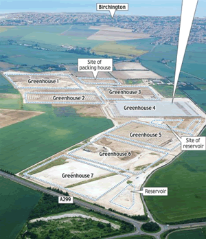 Ogni settimana saranno raccolti in queste serre 2,5 milioni di pomodori, 560.000 peperoni e 700.000 cetrioli. Questa massiccia produzione dovrebbe ridurre del 15% le importazioni di ortaggi da parte della Gran Bretagna.