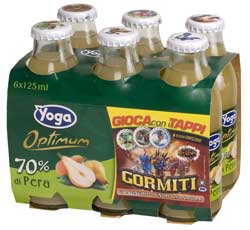 Dal mese di settembre e fino a febbraio 2008, tutte le confezioni di succhi di frutta Yoga Optimum in brik da 6x200 ml e 3x200 ml – nei gusti pera, pesca ed albicocca – regaleranno le Game Card dei “Gormiti", i nuovi pupazzi inventati da Giochi Preziosi, per un totale di 28 card da collezionare.Nelle confezioni di succhi di frutta Yoga in vetro da 6x125 ml – sempre nei gusti pera, pesca ed albicocca – saranno poi inseriti i tappi personalizzati con i personaggi delle varie serie dei Gormiti (6 in ogni confezione per un totale di 80 tappi).