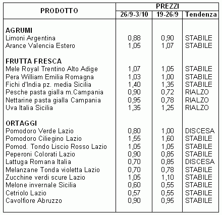 Per quanto riguarda la frutta fresca, da segnalare un leggero rialzo del prezzo all'ingrosso delle pesche, dovuto alla diminuzione delle quantità presenti sul mercato, a causa di una produzione ormai al termine.