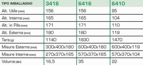 Sono ben finestrate per facilitare la traspirazione dei prodotti ortofrutticoli e sono dotate di portaetichettte rimovibili ad incastro secondo le norme Ice. Grazie al meccanismo delle sponde abbattibili, inoltre, 4 cassette chiuse occupano lo stesso spazio di una cassetta aperta.