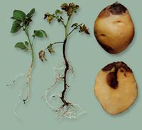 (1) Gamba nera della patata (Erwinia carotovora var. atroseptica) - E' una batteriosi abbastanza diffusa che manifesta i sintomi alla base dei fusti e dei tuberi. Sui giovani fusti si evidenziano, alla base, delle striature bruno-nerastre che provocano una perdita di turgore e di resistenza meccanica. In corrispondenza delle zone necrosate si può notare un essudato batterico sotto forma di gocce mucillaginose biancastre. I sintomi possono manifestarsi sia in campo sia in fase di conservazione.