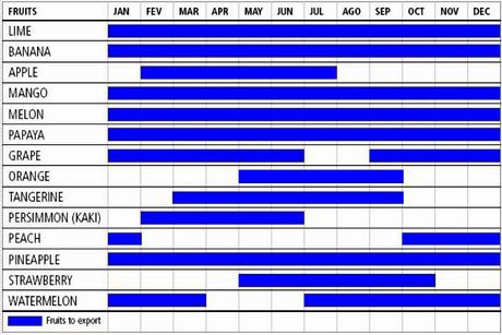 Questo programma di promozione riguarda le seguenti tipologie di prodotto: lime, mele, mango, meloni, papaya, uva, ananas, banane, arance, mandarini, pesche, kaki, fichi, fragole e angurie per quanto riguarda la frutta da consumo fresco. Polpa, succo, arachidi, acqua di noce di cocco e altro, per quanto riguarda il trasformato.