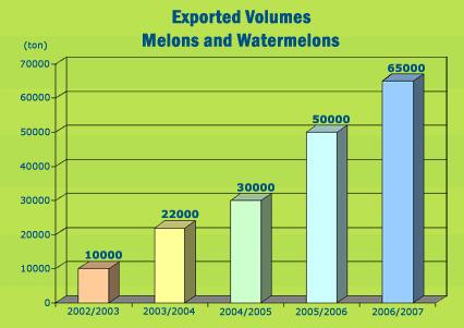 Sotto: crescita dei volumi esportati (in tonnellate) di meloni e angurie