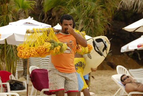 Con inequivocabile gesto della mano, questo venditore di frutta indica l'intenzione di farsi pagare per essere ritratto in fotografia.