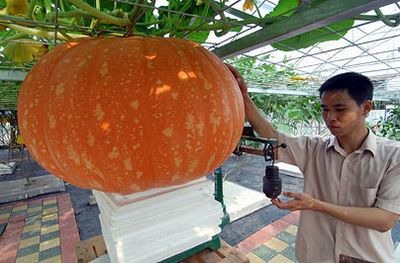 Una volta tornati sulla terra, questi semi "spaziali" sono stati coltivati in enormi serre riscaldate, dove hanno prodotto esemplari sovradimensionati, come quello ritratto nella fotografia. Gli scienziati cinesi sperano che i super-ortaggi, tra cui non solo zucche, ma anche cetrioli lunghi 60 cm, melanzane da oltre 6 kg di peso e piante di peperoncino che somigliano a piccoli alberi possano essere la chiave per rispondere alla crisi alimentare del pianeta.