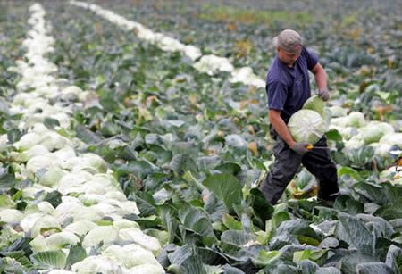 Un bracciante polacco impegnato nella raccolta di cavoli cappuccio nei pressi di Düsseldorf (Germania). La stagione del cavolo proseguirà fino a dicembre.