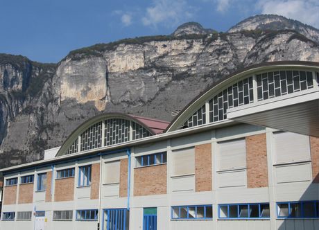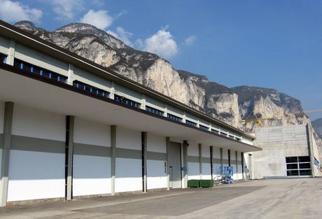 I profili del vecchio magazzino si stagliano contro le montagne che si trovano all'imboccatura della Val di Non.