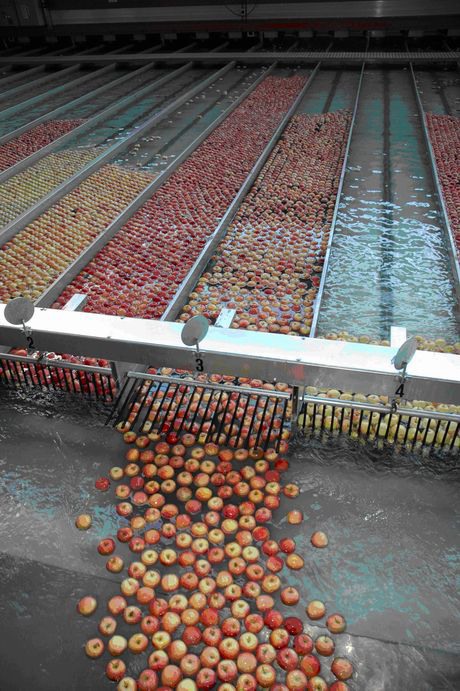 Una volta precalibrate le mele vengono scaricate dai canali della calibratrice e depositate in cassoni (bins). Successivamente vengono depositate nelle celle frigorifere in attesa di essere commercializzate.