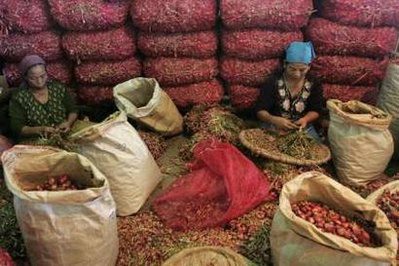 Indonesia: donne intente nella pelatura delle cipolle al mercato della verdura