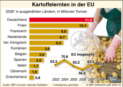 La Germania, con 11,3 milioni di ton rimane saldamente in testa come principale paese europeo produttore di patate, seguito da Polonia (10,4 mln ton), Francia (6,8 mln ton) e Olanda (6,7 mln ton). L'Italia è al nono posto, con un volume produttivo pari a 1,7 milioni di tonnellate.