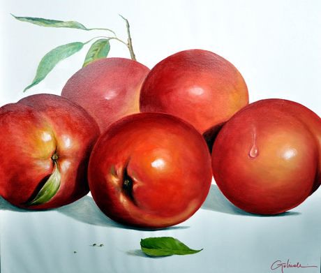 Un dipinto raffigurante frutti di pesca negli uffici di Salvi-UNACOA. (Foto: FreshPlaza Italia).