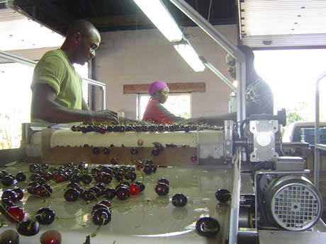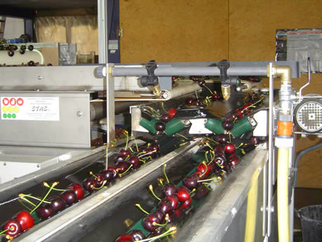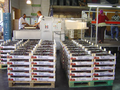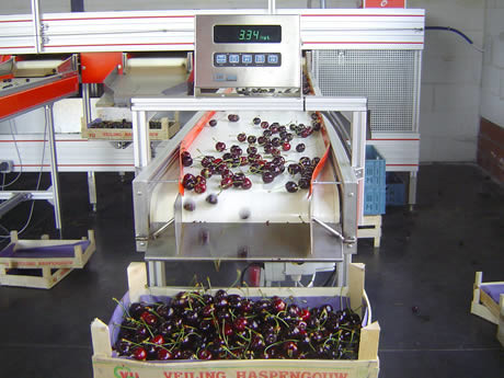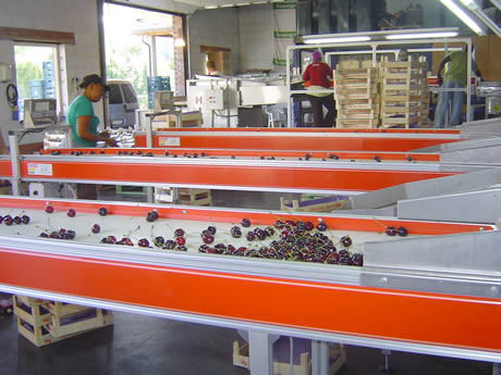 Quando le ciliegie appena colte arrivano in magazzino, vengono poste in acqua, dove sono raffreddate e lavate. Successivamente, vengono inviate a varie linee di selezionamento, in modo da eliminare la merce difettosa. A quel punto, i macchinari fotografano ogni singola ciliegia e sono in grado, in base al suo calibro e al colore, di smistarle sui nastri trasportatori appropriati, per procedere al corretto confezionamento.