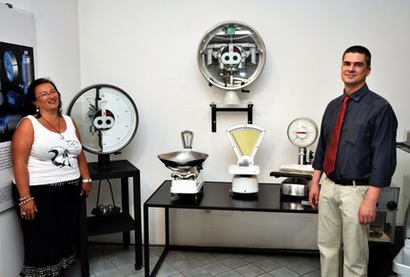 Vanna Secchi e Giampaolo Fantinato insieme ad alcuni esemplari storici realizzati dalla Bilanciai nel corso della sua lunga storia ed esposti al Museo della Bilancia. (Foto: FreshPlaza Italia).