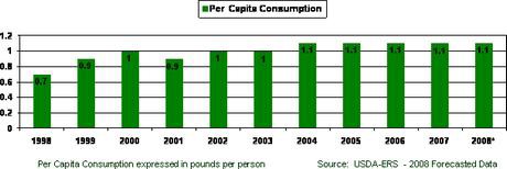 Nonostante la quota di mercato per gli asparagi peruviani sul mercato USA sia cresciuta nel corso degli ultimi anni, il consumo medio pro-capite è ancora al palo, fermo su un valore di 1,1 libbre (solo circa 500 grammi) l'anno, dopo aver conosciuto una brillante ascesa del 37% dal 1998 (vedi tabella qui sotto).