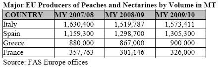 Per la stagione commerciale 2009/10 nella UE-27, il dipartimentoamericano dell'agricoltura (USDA) stima una produzione di pesche enettarine pari a 4,2 milioni di tonnellate, leggermente superiore rispetto alla stagione precedente, grazie alle condizionimeteorologiche favorevoli durante le fasi di fioritura e maturazione (vedi anche precedente articolo).I principali paesi produttori in Europa sono Italia, Spagna, Grecia e Francia. L'Italia è il maggiore produttore, mentre la Spagna è il principale esportatore, grazie alla sua raccolta precoce.