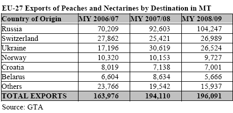 Le principali destinazioni delle pesche europee sono Russia, Svizzera e Ucraina. Grazie alla raccolta precoce, la Spagna ha dominato sul mercato per tutto maggio e giugno. Durante questo periodo, la Spagna ha esportato pesche persino in Italia, principale paese concorrente.
