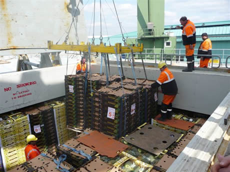 La nave ha diversi ponti, 4 in totale. Ognuno viene aperto in più punti per permettere alle gru di agganciare i pallet e scaricarli: si tratta di un lavoro di grande precisione. I pallet, 4 alla volta, vengono in seguito portati sulla banchina da grossi camion, alla volta delle celle di trasbordo.