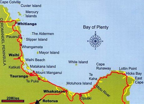 Immagine sotto: in verde la regione della Baia di Plenty (in cui si trova la penisola Te Kaha) e in rosso la regione della Tasman (dove dovrebbe essere realizzata la diga).