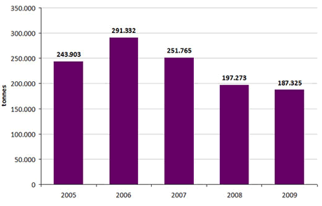 I volumi sono in calo dal 2006, quando la produzione ammontava a 291.332 tonnellate. Nel 2007 si registrò una produzione di 251.765 ton (-13,6%), nel 2008 fu di 197.273 ton (-21,6%) e nel 2009 si fermò a 187.325 ton (-5%).