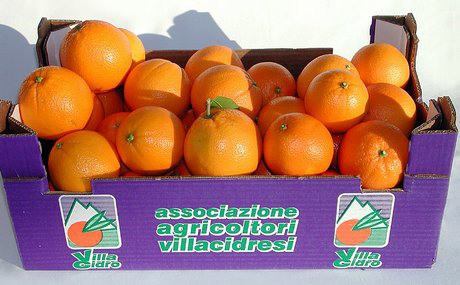 Cassetta di cartone con arance Navel La raccolta appena cominciata si protrae fino a gennaio