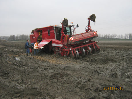 Molti produttori e lavoratori a cottimo stanno facendo di tutto per riuscire a raccogliere. Con gli attuali prezzi di mercato "l'oro giallo" è infatti ben quotato, anche se i problemi in termini di qualità sono tanti. Venerdì scorso, nel comune olandese di Nieuw en Sint Joosland un macchinario cingolato per la raccolta di patate è rimasto bloccato nel fango. Di seguito una serie di foto.
