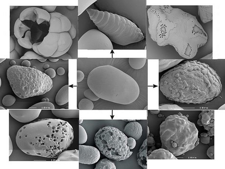 Nelle foto: un'immagine al microscopio di un normale granulo di amido (al centro), contornato da varie altre formazioni rese possibili dall'ingegneria genetica.