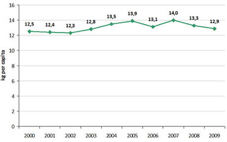 Consumo pro capite di pomodori in Francia: 2000-2009