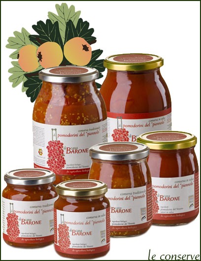 Foto sotto: barattoli di conserva biologica di pomodorini del piennolo del Vesuvio DOP tradizionale e in salsa.
