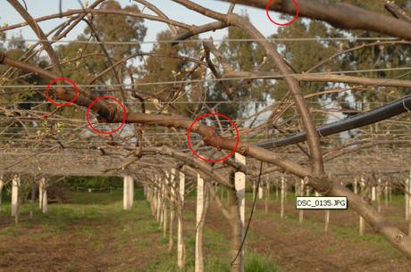 Evidenziati dai cerchi rossi, diversi sintomi sulla pianta di actinidia. (Fonte: KVH, per gentile concessione a FreshPlaza).