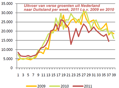 L'export verso la Germania ha in gran parte risentito del forte calo registrato durante il picco della crisi EHEC, ma è ancora in calo settimanalmente rispetto alla media del periodo 2008-2010. Si registrano quindi ancora problemi con l'export nei principali mercati di destinazione. Oltre alla questione EHEC giocano un ruolo altri fattori, come il maltempo estivo, non proprio a favore della vendita di ortaggi da insalata.
