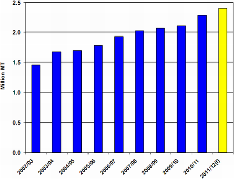 Le importazioni di patate surgelate nel mondo sono previste ancora in crescita nella stagione 2011/12. Nota: l'USDA non include nei dati sulle importazioni gli scambi commerciali tra i paesi dell'UE.