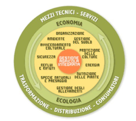 La produzione integrata riguarda invece una concezione più ampia della sola difesa integrata. Non si occupa solo di agrofarmaci, ma include il sistema complesso dell’azienda agricola in una strategia di lungo periodo. Va dalla produzione delle sementi all’immagazzinaggio dei prodotti finiti, all’utilizzo dell’energia, del suolo, ecc.