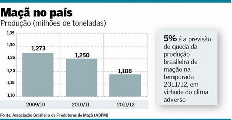 La grandine che in dicembre aveva colpito la Sierra catarinense (la zona montuosa a sud del Brasile) è tornata all'inizio di gennaio provocando nuovi danni, tanto che l'Associazione brasiliana dei produttori di mele (ABPM) prevede per la campagna 2012 una diminuzione del 5% rispetto allo scorso anno. Secondo il presidente dell'organizzazione, Pierre Pérès, la regione di San Joaquin è stata la più colpita dal gelo e subirà perdite in termini produttivi e qualitativi.Nel 2011, la regione aveva già subito danni per la grandine con perdite in volume e qualità della frutta. Secondo i dati ABPM, nella scorsa stagione, sono stati raccolti circa 1,250 milioni di tonnellate, un volume minore rispetto al periodo precedente (2009/2010), quando ne furono prodotti 1,273 (vedi grafico sottostante).