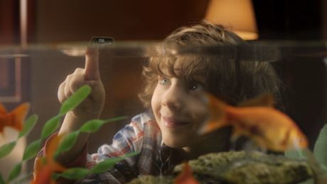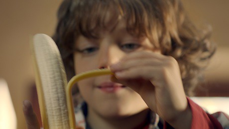 Protagonista dello spot (nelle foto sopra e sotto) è un bambino che gioca con l’etichetta di un frutto attaccata a un dito, come fosse un furgoncino giocattolo, e le fa compiere il viaggio ideale (ma anche vero) dai frutteti fino alla tavola di casa.
