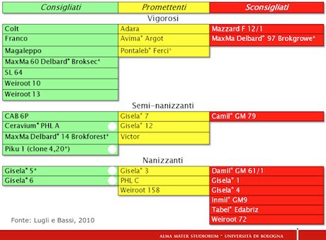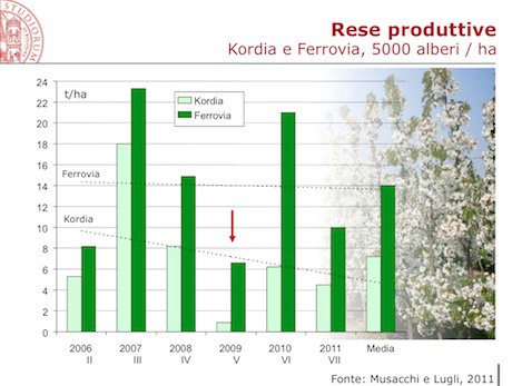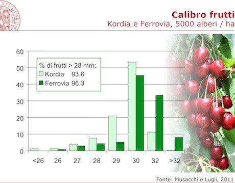 Passando ai risultati ottenuti dalle sperimentazioni condotte dal DCA di Bologna, Lugli ha evidenziato come: "Con 1.000 piante/ha si possono raggiungere produzioni interessanti, intorno alle 15-20 ton/ha, sia con varietà autofertili, es. Lapins, che con le altre varietà, come Regina. Queste ultime, solo con soggetti nanizzanti. I livelli qualitativi risultano però influenzati, negativamente, da questi portinnesti".